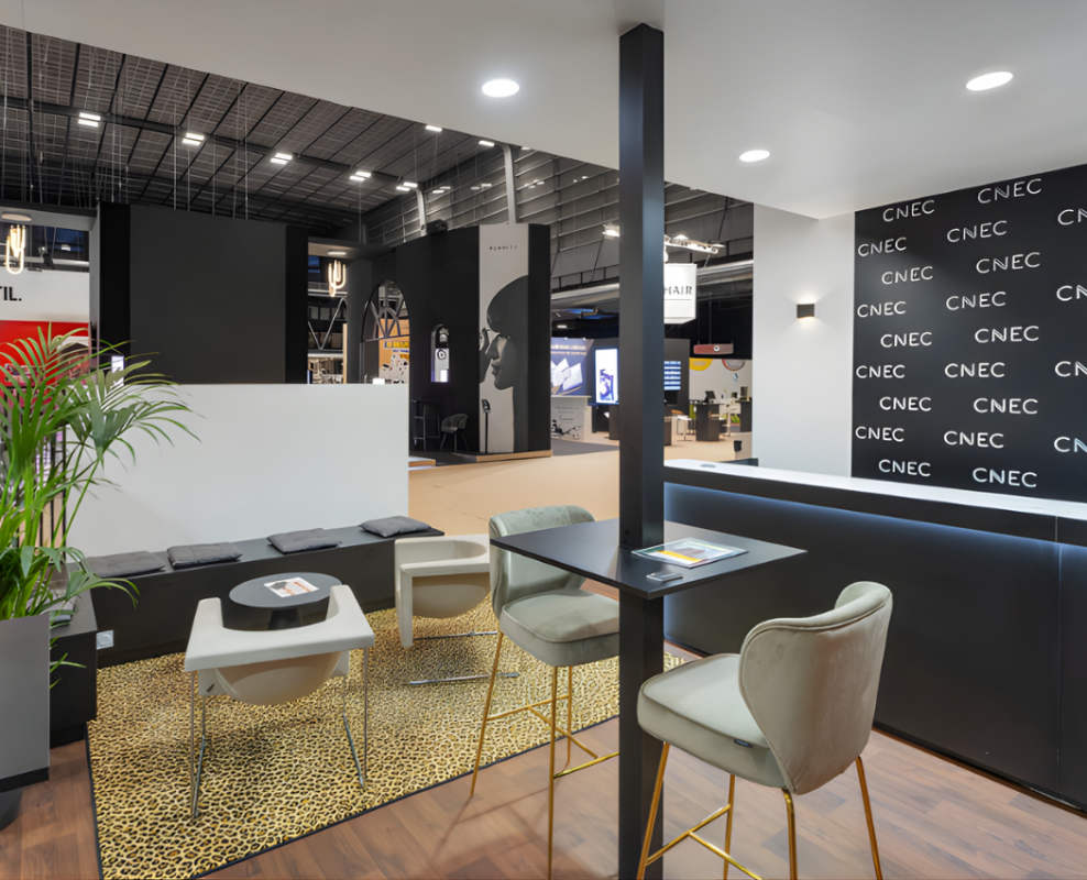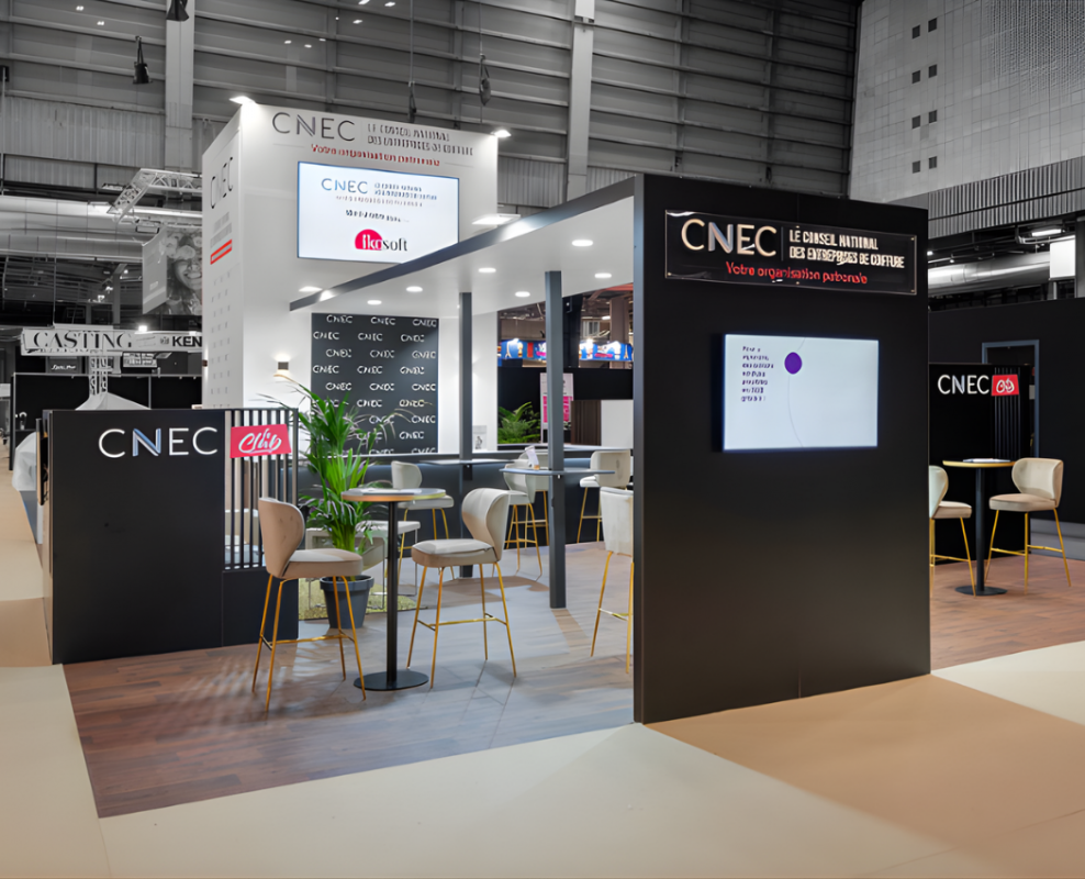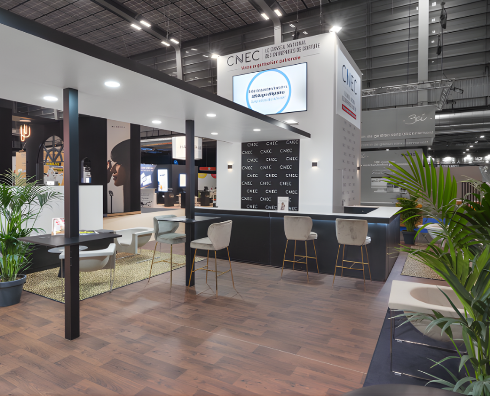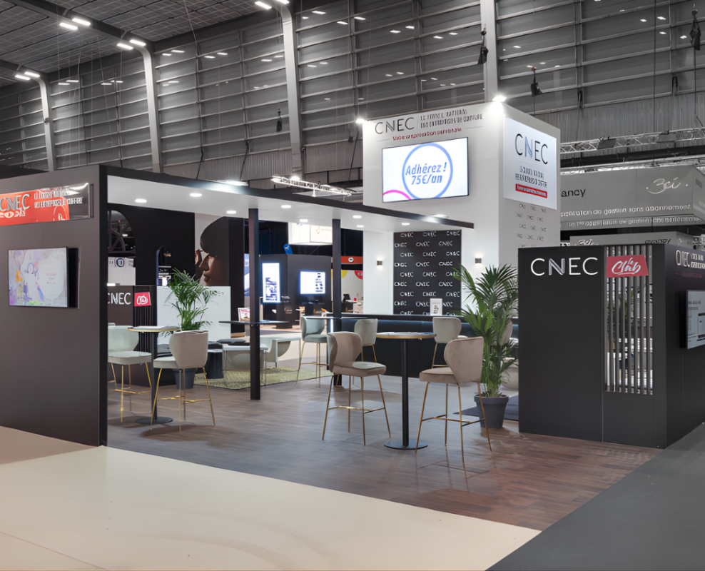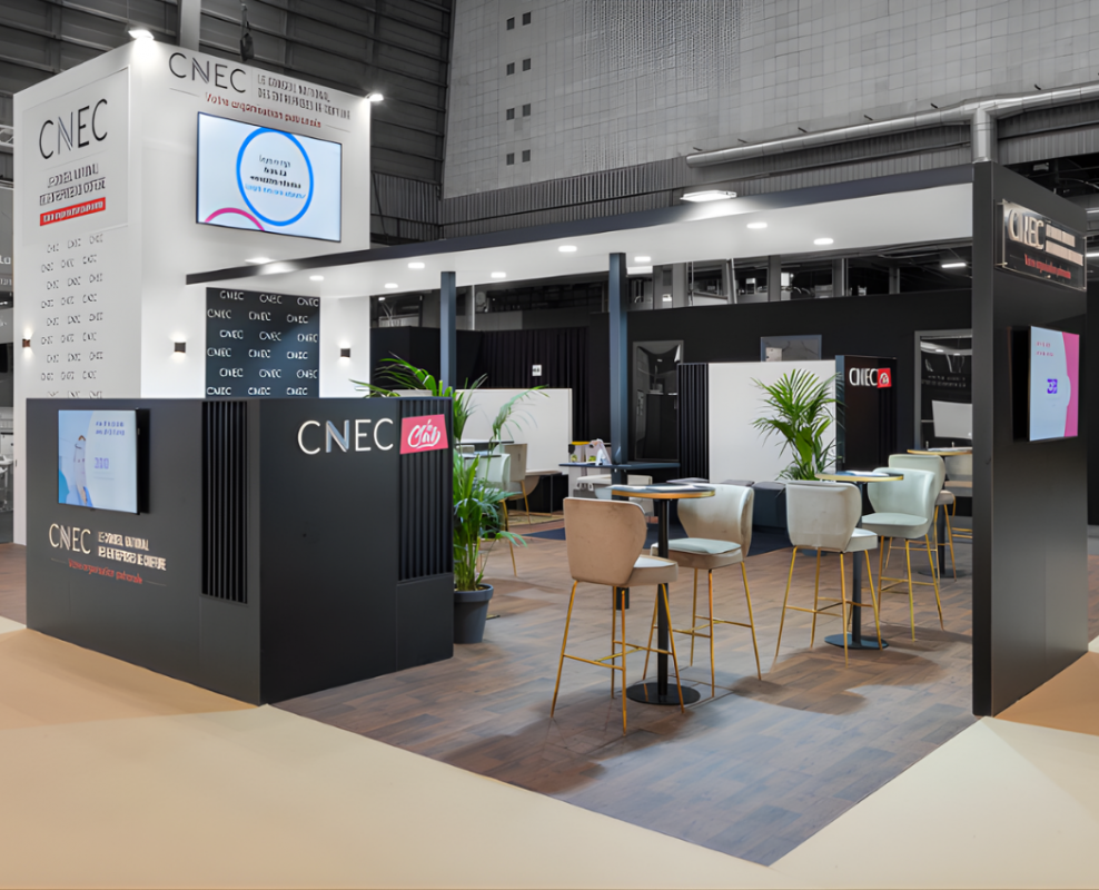 Pour le stand du CNEC, l’aménagement repose sur un espace ouvert structuré par plusieurs cloisons habillées de visuels, un comptoir central et un volume vertical mettant en avant l’identité de l’organisation. L’agencement intègre des zones d’accueil, de réunion et de circulation, offrant un parcours fluide dans un environnement soigné. L’ensemble compose une présence événementielle claire et efficace, adaptée aux exigences d’un salon professionnel.