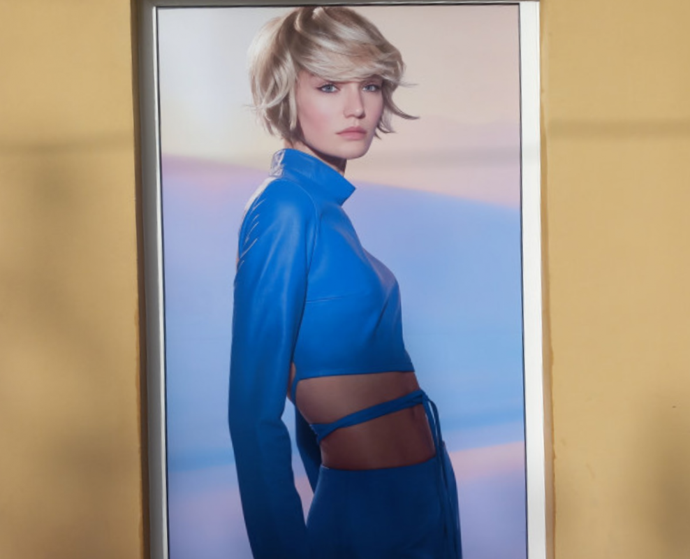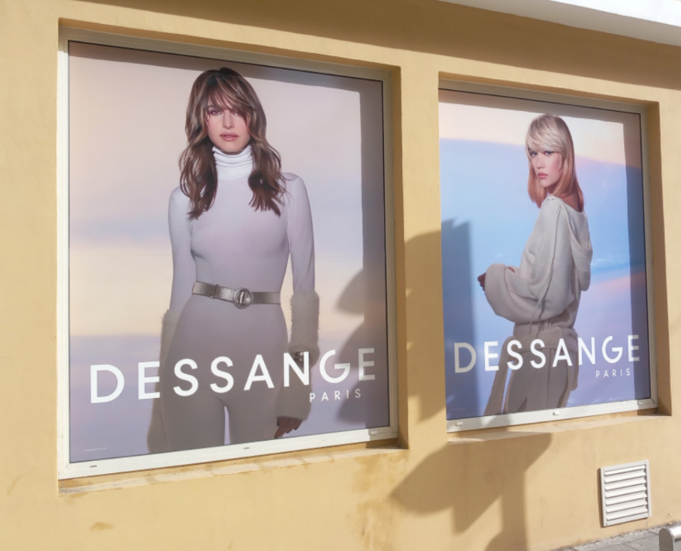 Habillage du salon Flagship aux couleurs de Dessange Paris et de la boutique de Nice. On retrouve ici des éléments de signalétique extérieure forts permettant une belle visibilité de la marque Dessange auprès des passants. Les vitrines ont été habillées d'adhésif microperforé et disposent de stores et lambrequins lumineux. A l'entrée, une plaque en plexiglas élégante reprend les codes graphiques de cette enseigne nationale.