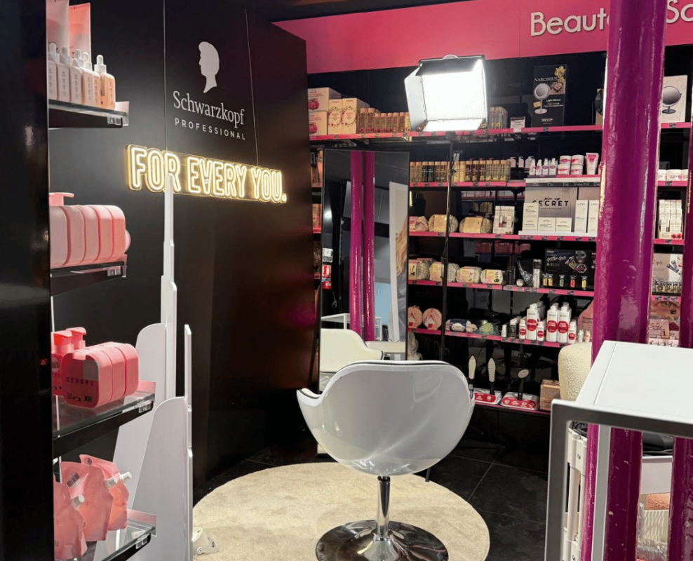Pour l’agence All4You, Insitis a conçu et installé une scénographie complète pour Schwarzkopf Professional dans un magasin La Boutique du Coiffeur. Plusieurs supports ont été conçus : une enseigne néon lumineuse pour valoriser l’espace, des éléments en Viscom découpés à la forme pour un rendu 2D, ainsi qu’un photobooth grand format. L’ensemble a été pensé pour offrir une expérience immersive et cohérente avec l’univers Schwarzkopf.
