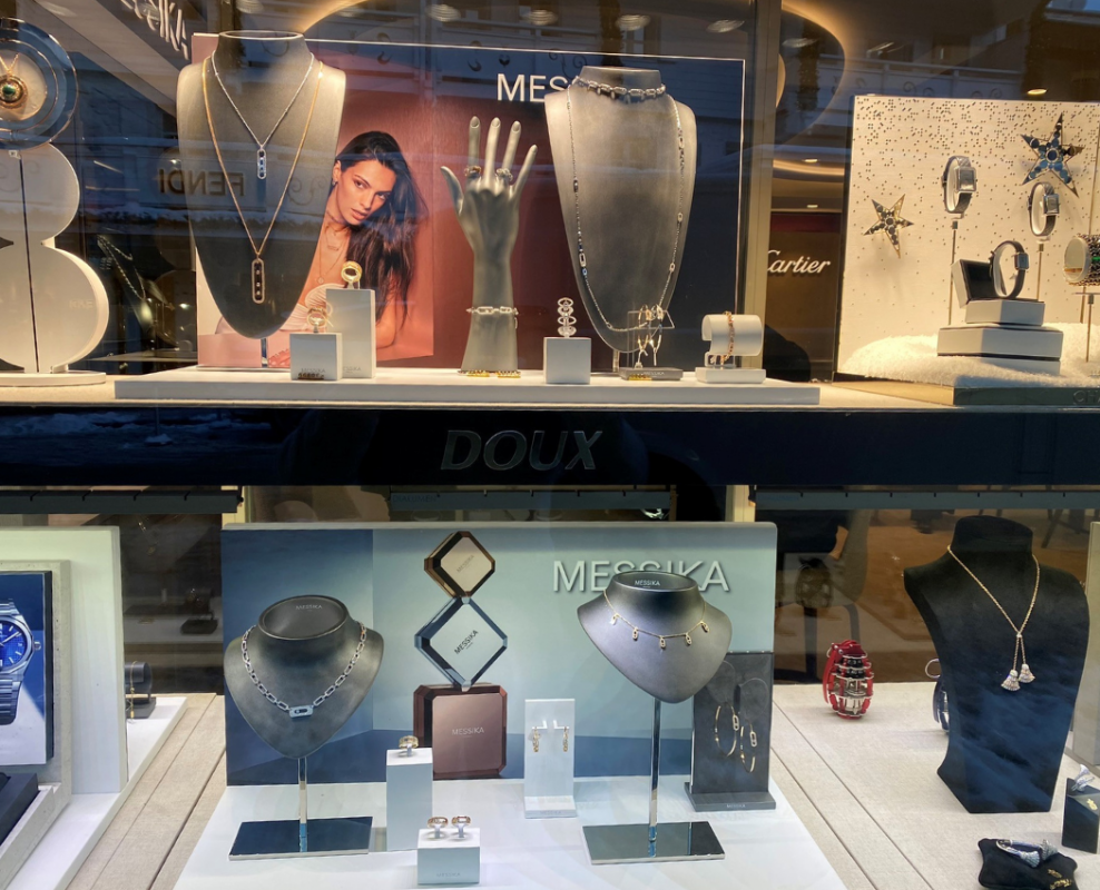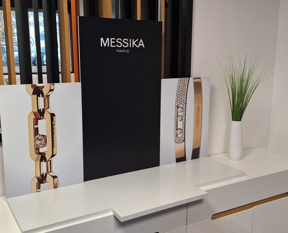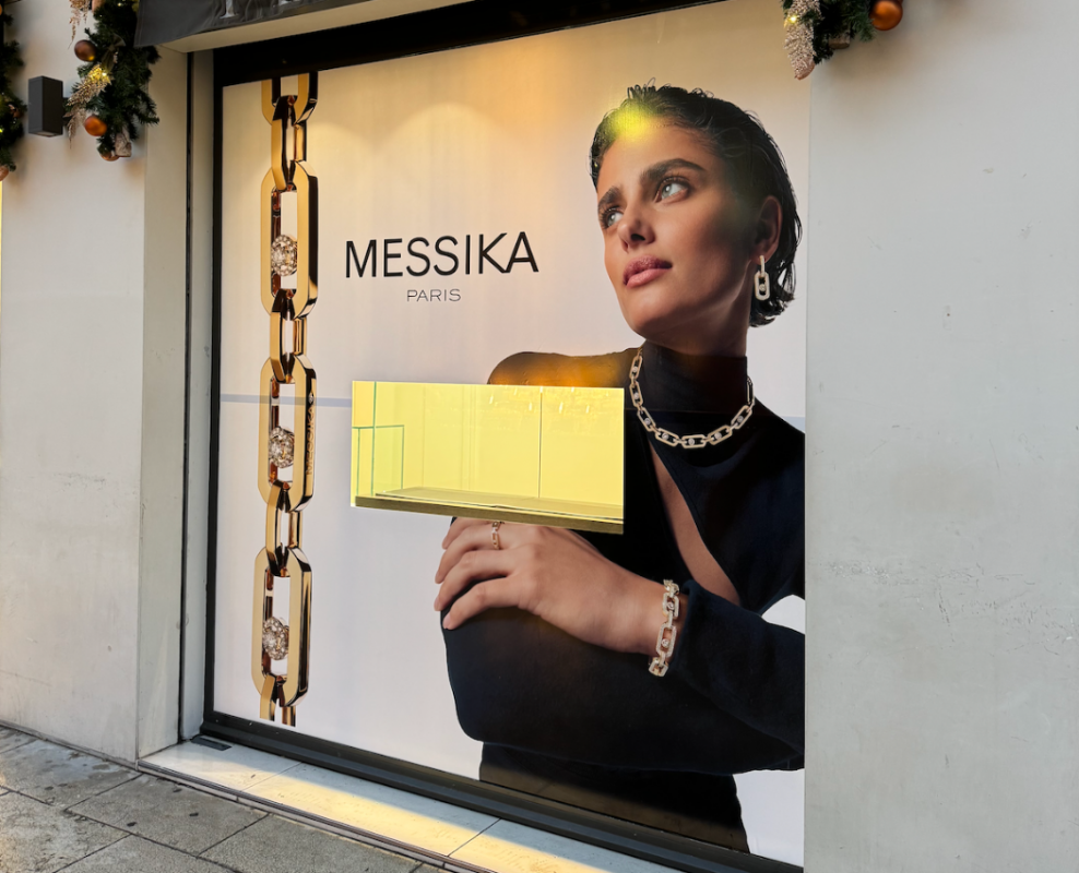 Insitis accompagne la maison Messika dans la conception et la fabrication de supports haut de gamme pour ses boutiques en France et à l’international. Nous conçevons et produisons de nombreux éléments : présentoirs PVC, toiles pour cadres lumineux, lettrages PMMA, vitrophanie, adhésifs, panneaux et fonds de vitrine en PVC, affiches papier photo, ainsi que des habillages d’escaliers et displays en plexi. Ces interventions, déployées à Paris, Courchevel, Angers, Reims, Rouen, Dijon, Poitiers, Le Mans, Agen, Amiens et jusqu’en Grèce ou en République Tchèque, illustrent la maîtrise technique d’Insitis au service de l’identité Messika.